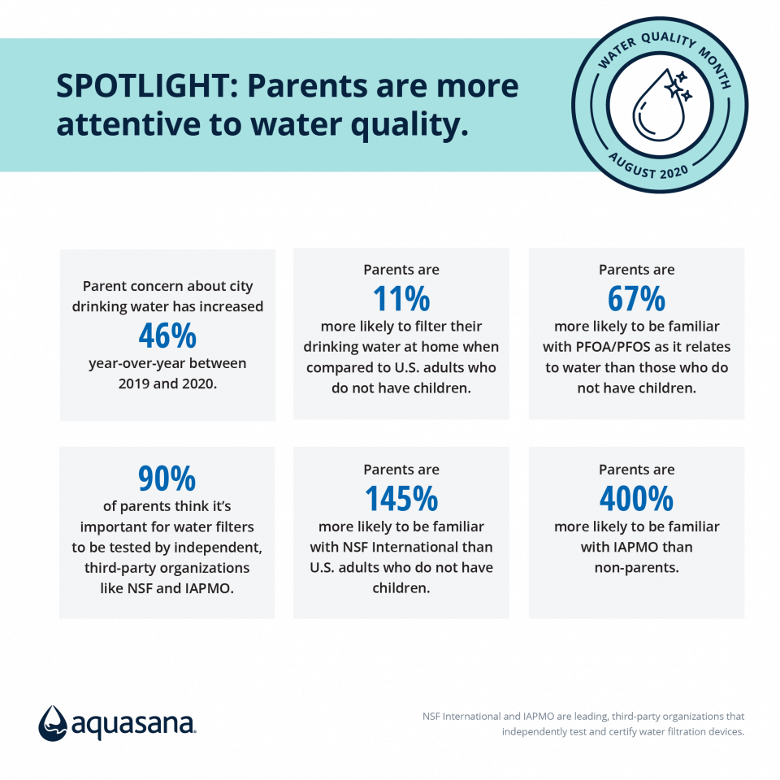In addition to being more aware of certain water contamination issues and more likely to filter their water at home, parents are much more likely to have familiarity with third-party testing and certification organizations such as NSF International and International Association of Plumbing and Mechanical Officials (IAPMO). Specifically, parents are 145% more likely to be familiar with NSF International and 400% more likely to be familiar with IAPMO than non-parents.