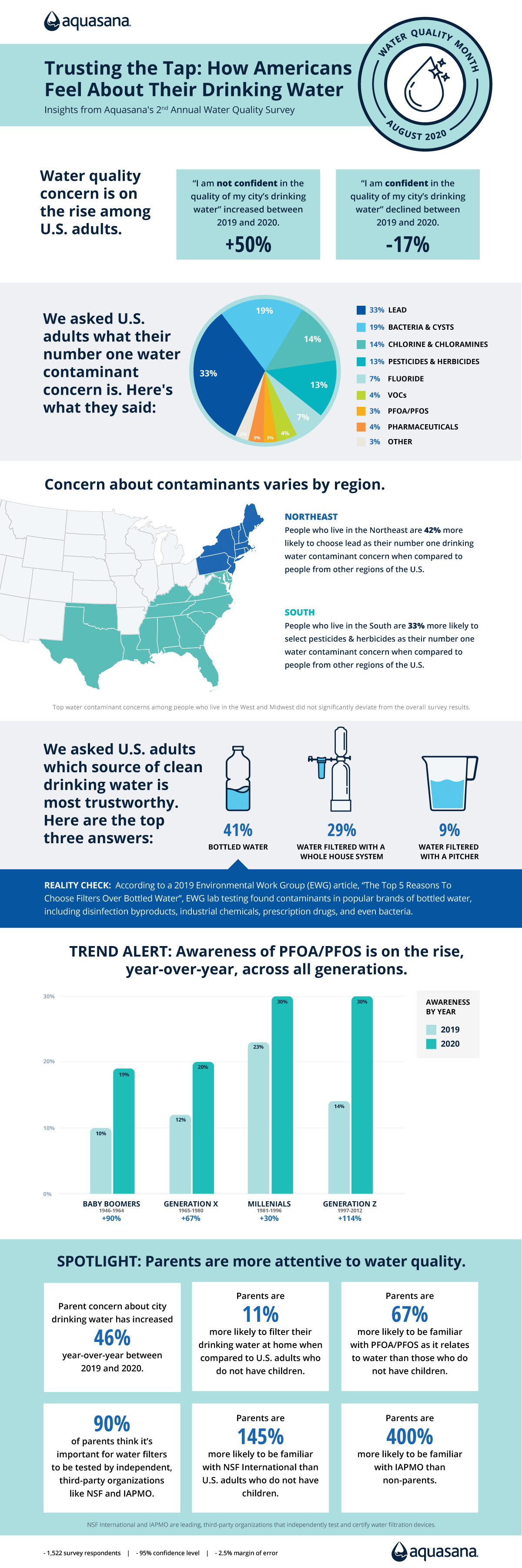 Each August we observe National Water Quality Month. The goal is to spread awareness about water quality issues and make changes to help preserve water resources. To do our part during National Water Quality Month, we commissioned our second annual Water Quality Survey of more than 1,500 U.S. adults to gauge consumer knowledge and concerns about the quality of their drinking water — with the ultimate goal of uncovering insights that will help people find water treatment solutions they can trust.
