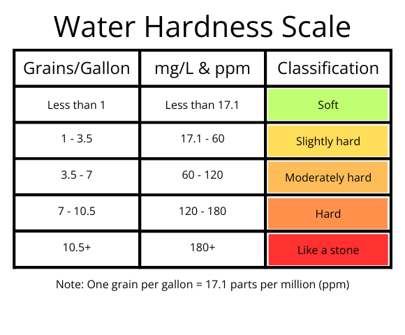 Water hardness is measured in grains per gallon (GPG) or parts per million (ppm), which refer to the concentration of dissolved minerals in water. The scale below is how your water hardness is determined based on its GPG or ppm level, which you can see in your water quality report or a water hardness test.