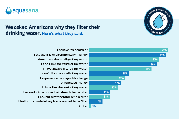 At 37%, lack of trust in the quality of drinking water is the third highest motivation for people who filter. Even if consumers rely on public tap water that’s frequently tested and treated by the city, consumers may not be satisfied with environmental standards on the level of contaminants that are allowed to be in water. Even after water has been treated — there’s still a risk for recontamination as it travels from the treatment facility through water lines to homes.
