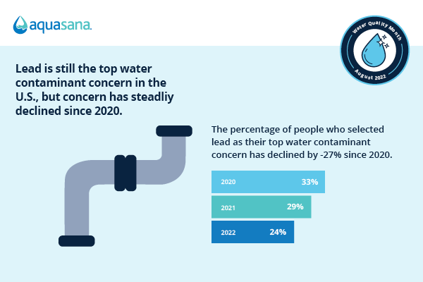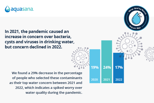 Rounding out the top three contaminant concerns in 2022 — bacteria, cysts, and viruses received 17% of the vote and saw a year-over-year decrease relative to our last survey. The contaminant had a 19% vote share in 2020, then jumped to 24% in 2021 in correlation with the COVID-19 pandemic, but dipped down to 17% this year. Despite the decrease, the pandemic remains top of mind for Americans who selected this as their top concern — as 40% of people who chose it said “the COVID-19 pandemic made me more concerned about bacteria, cysts, and viruses being in my water.”