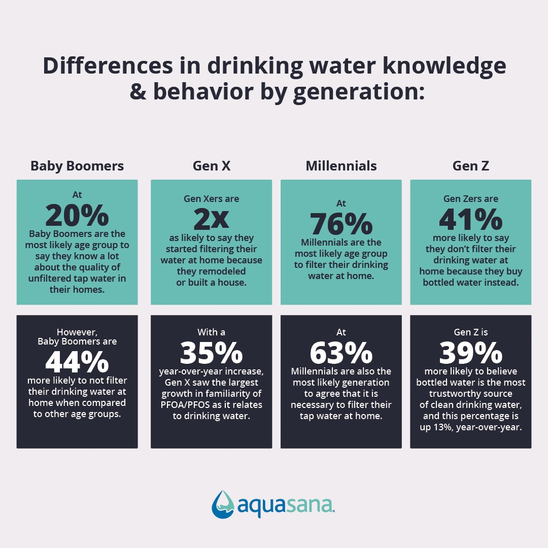 Overall, the 2021 Aquasana Water Quality Survey made it clear that each generation has its own unique set of beliefs and behaviors when it comes to water quality. We discovered that while Baby Boomers claim to be the most knowledgeable age group about their tap water, they’re actually the least likely to filter it. In contrast, Millennials are actually the most knowledgeable about water quality and are also the most likely to use a water filter. Finally, resourceful and independent Gen Xers impressed with greater knowledge about emerging water contaminants such as PFOA/PFOS. And surprisingly, Gen Zers — known for their climate action enthusiasm — showed the highest level of trust and consumption of bottled water bottles, though we expect that to decline in the future.