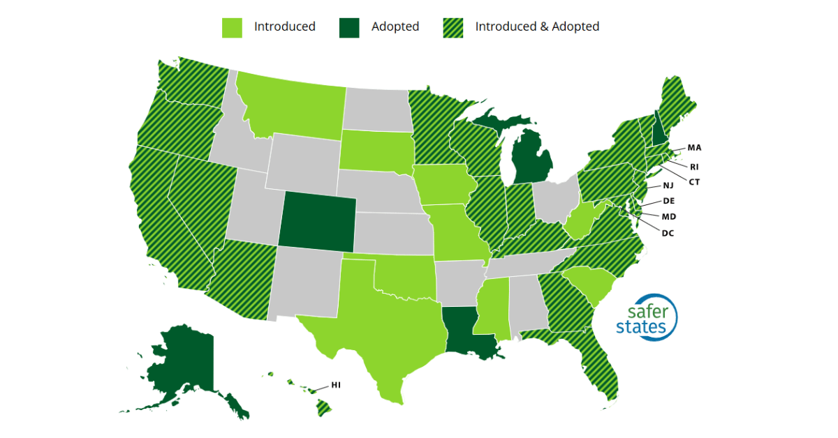 As of March 2025, 30 states have adopted policies for addressing PFAS. In total, 34 states have introduced 195 policies and 154 have been adopted. Safer States’ PFAS policy map displays where policies have been introduced, adopted, and introduced & adopted.