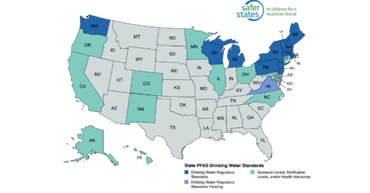 Safer States also provides a map with information about state PFAS drinking water standards, which shows twelve additional states that have a guidance, health advisory, or notification level for PFAS chemicals.